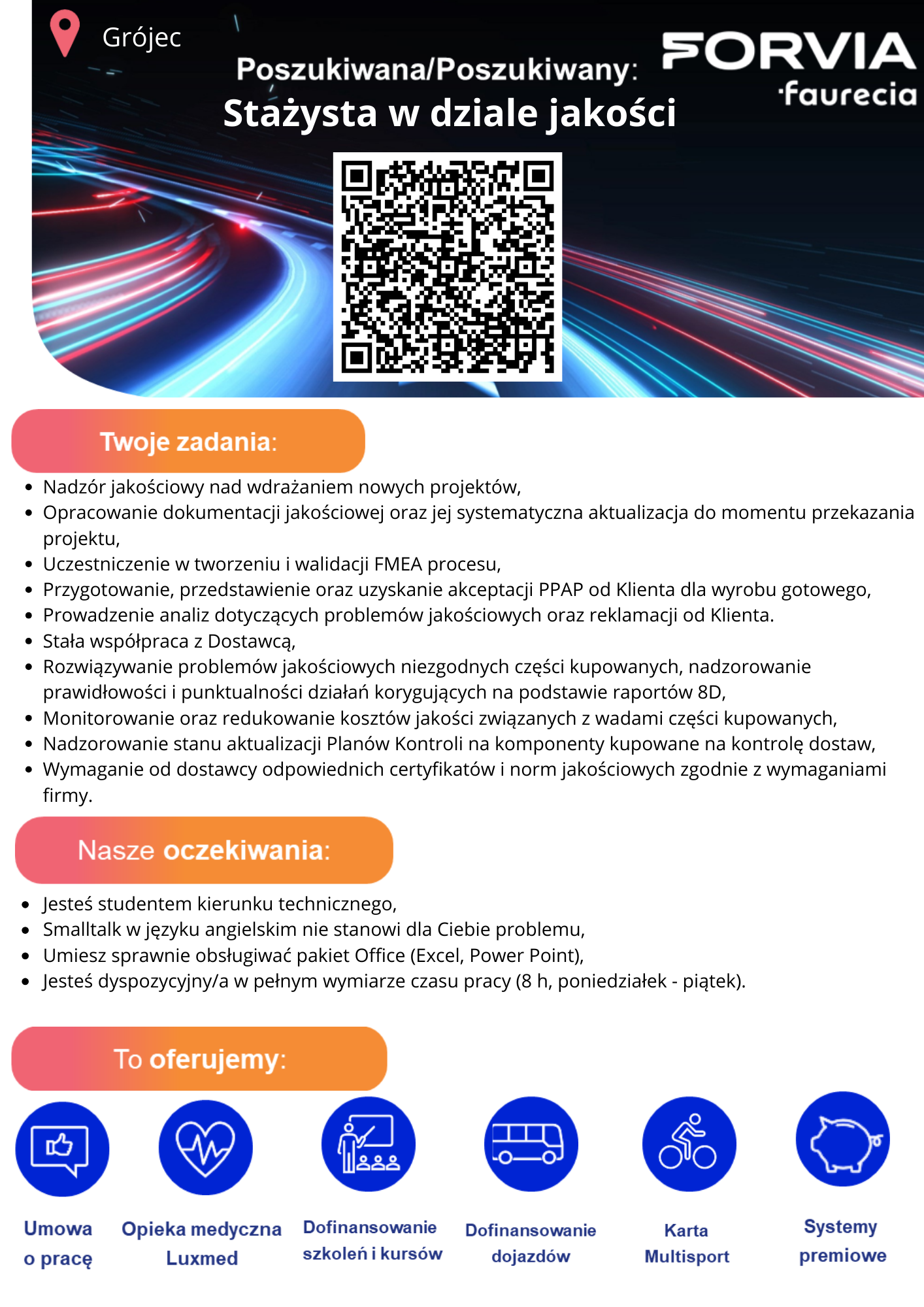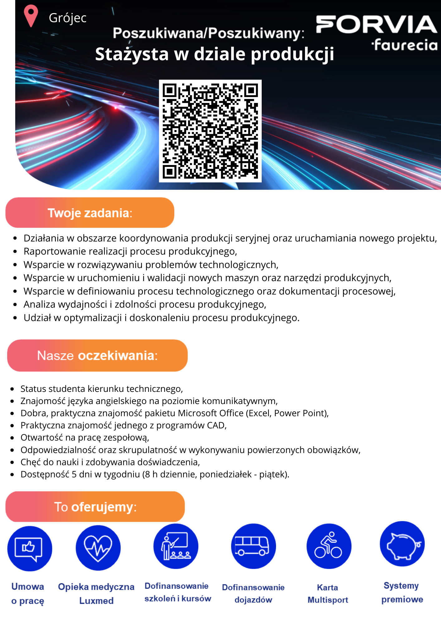 Firma Faurecia Automotive Polska S.A. w Grójcu (FORVIA) poszukuje stażystów produkcji i jakości. Program stażowy dedykowany jest do studentów chcących zdobyć pierwsze doświadczenie zawodowe. Staż może trwać max. 15 miesięcy. Zachęcamy młodzież do aplikowania. Więcej informacji: https://www.pracuj.pl/praca/stazysta-w-dziale-produkcji-grojec-spoldzielcza-4,oferta,1002894748?s=9c7d5191&searchId=MTY5NzQ0OTEyOTQ5Ny4xMzk2 https://www.pracuj.pl/praca/stazysta-w-dziale-jakosci-grojec-spoldzielcza-4,oferta,1002905834?s=b75c0c29&searchId=MTY5NzU0MDkxMTQ2MS4yMDI0